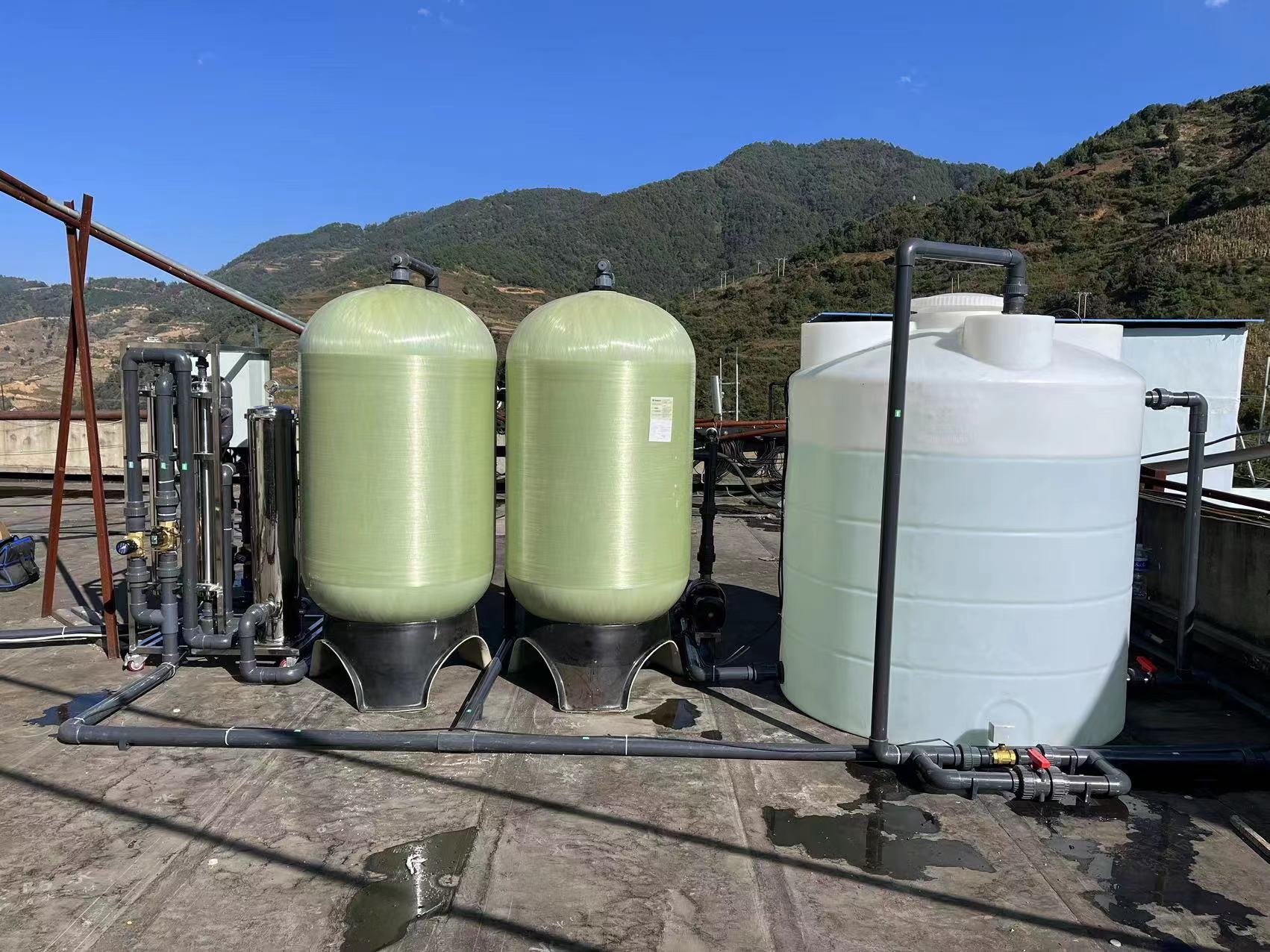 工藝流程:進(jìn)水→原水箱→原水輸送泵→多介質(zhì)過(guò)濾器→活性炭過(guò)濾器→精密過(guò)濾器→超濾過(guò)濾裝置(產(chǎn)水量≧10T/H)→超濾水箱→出水口。